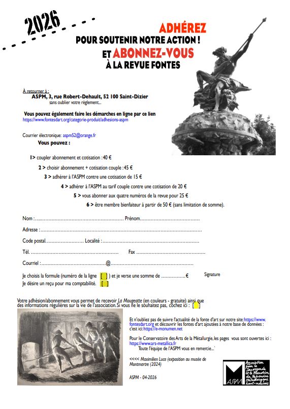 L’association pour la sauvegarde du patrimoine métallurgique haut-marnais vous propose de soutenir son action en adhérant pour l’année en cours. Une somme modeste, mais un appui précieux pour la fonte d’art.