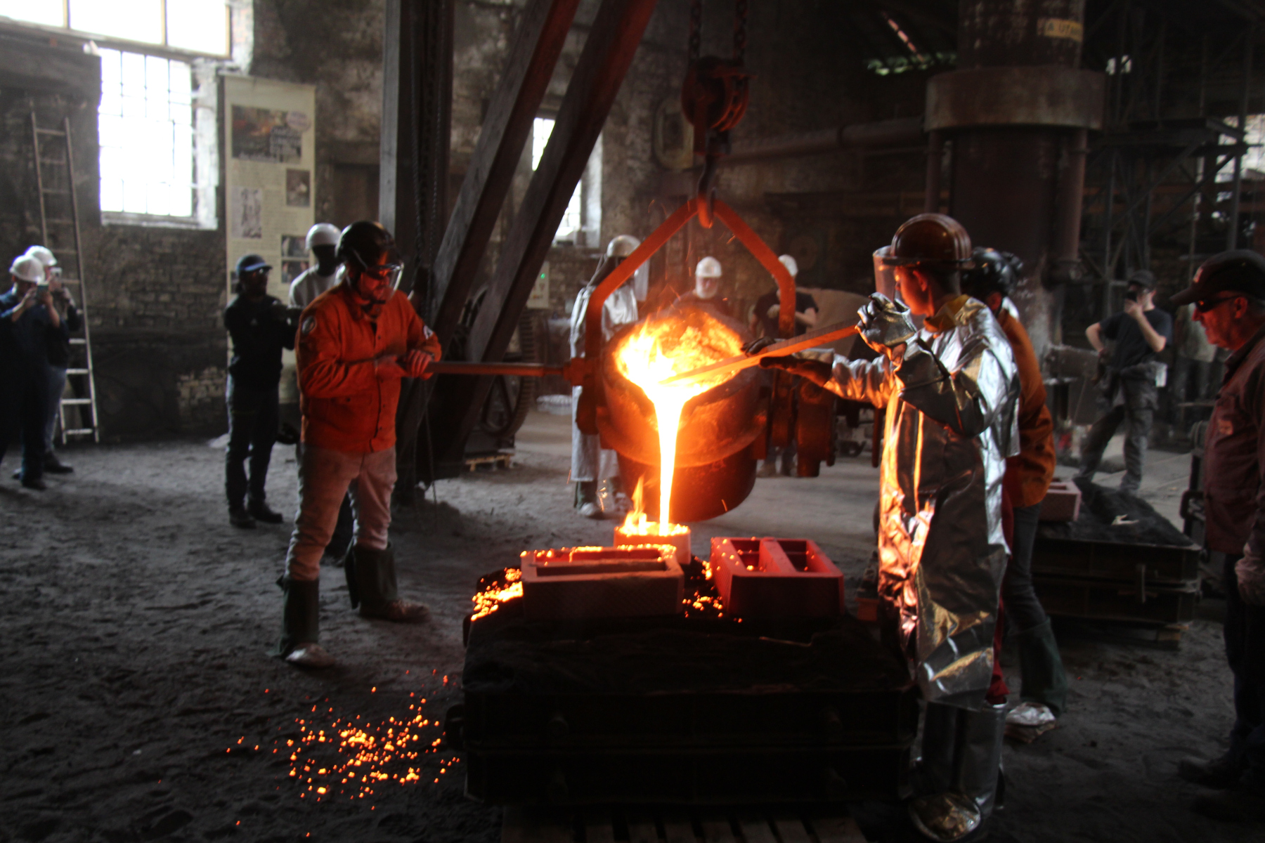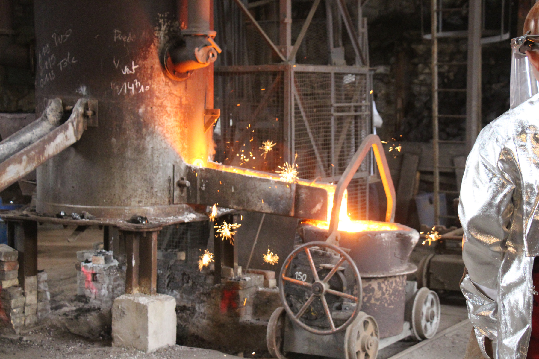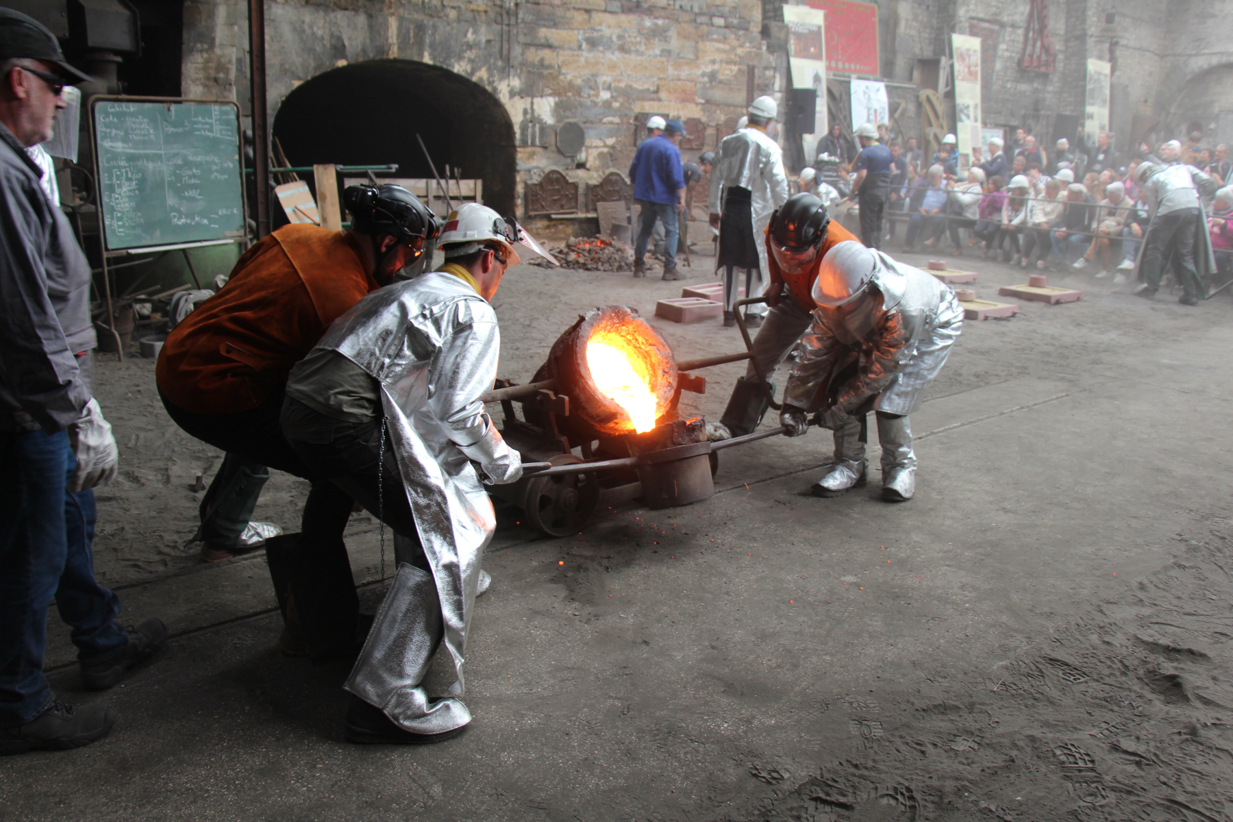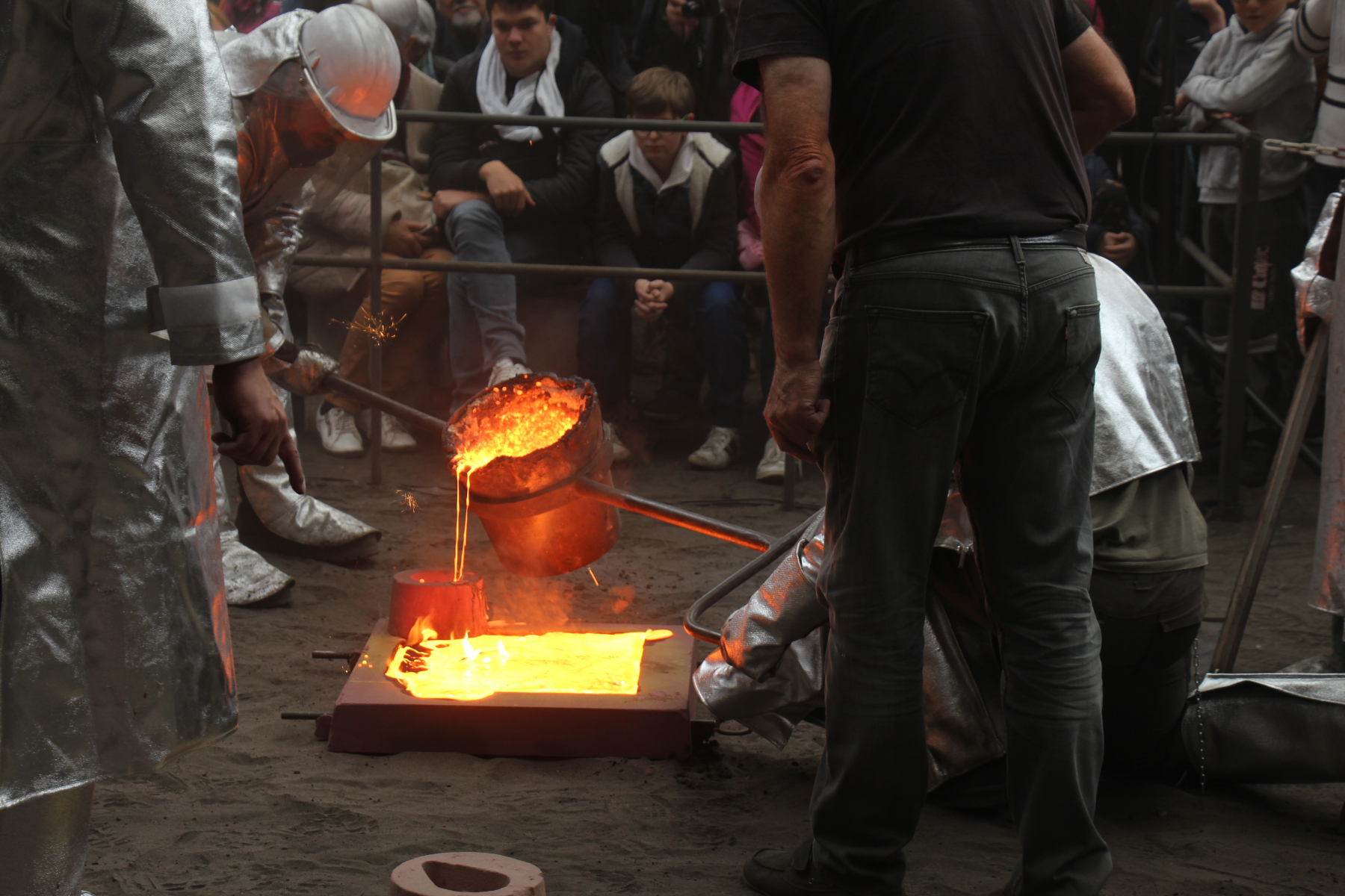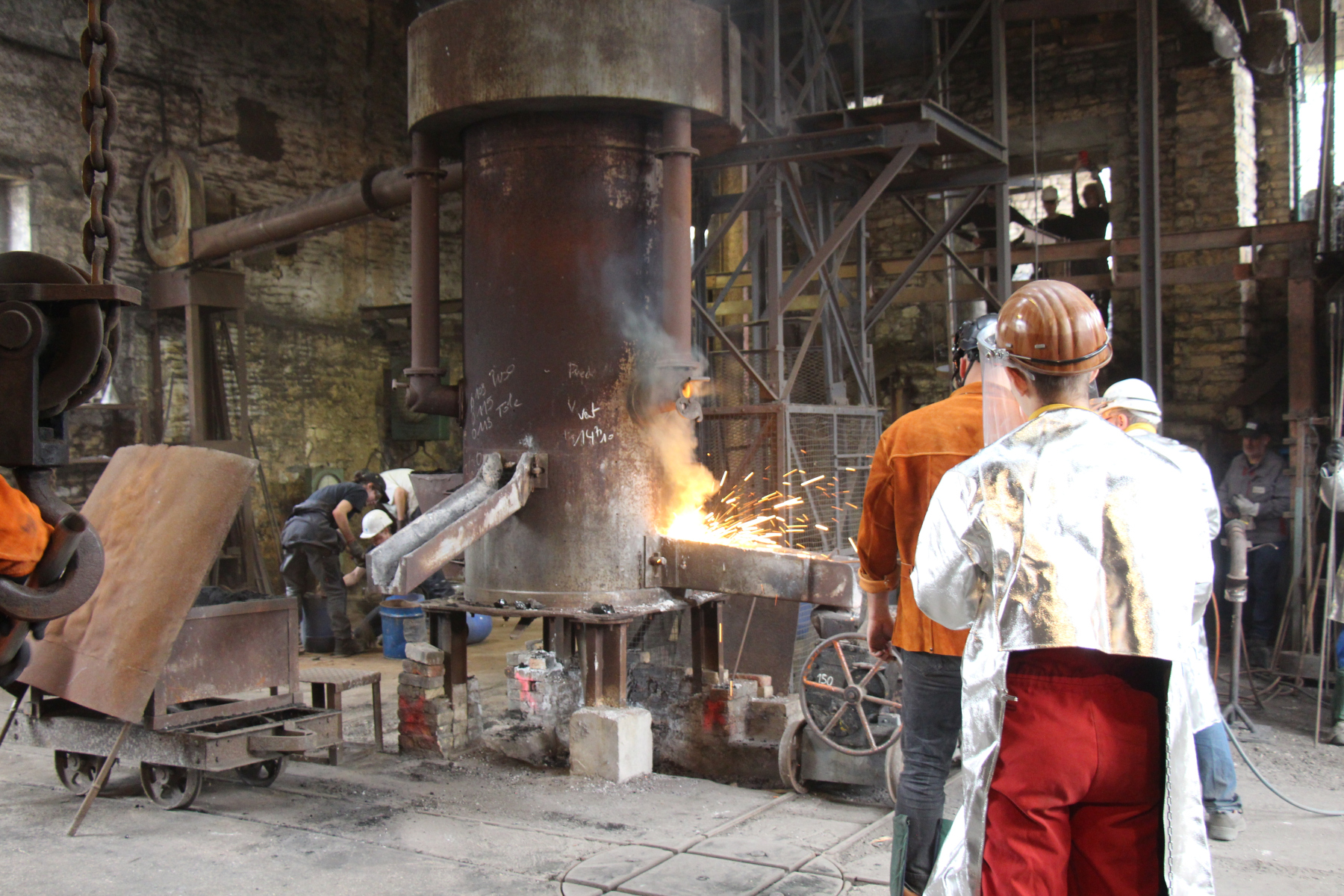 La fonte en fusion est toujours appréciée par les spectateurs installés pour assister à ce spectacle qui se déroule devant eux avec les commentaires de Michel. Ensuite vient le temps du décochage, ce qui permet de voir les pièces réalisées dont une cariatide d’une fontaine Wallace. Pendant ce temps la présidente de l’Aspm fait visiter le Paradis et les autres halles du conservatoire à un groupe de visiteurs de Chalons en Champagne venus visiter le conservatoire et Métallurgic Park, centre d’interprétation de la métallurgie situé à 300 m. La journée se termine sans pluie et à la satisfaction de tous les visiteurs et de tous ceux qui ont préparé cet évènement.