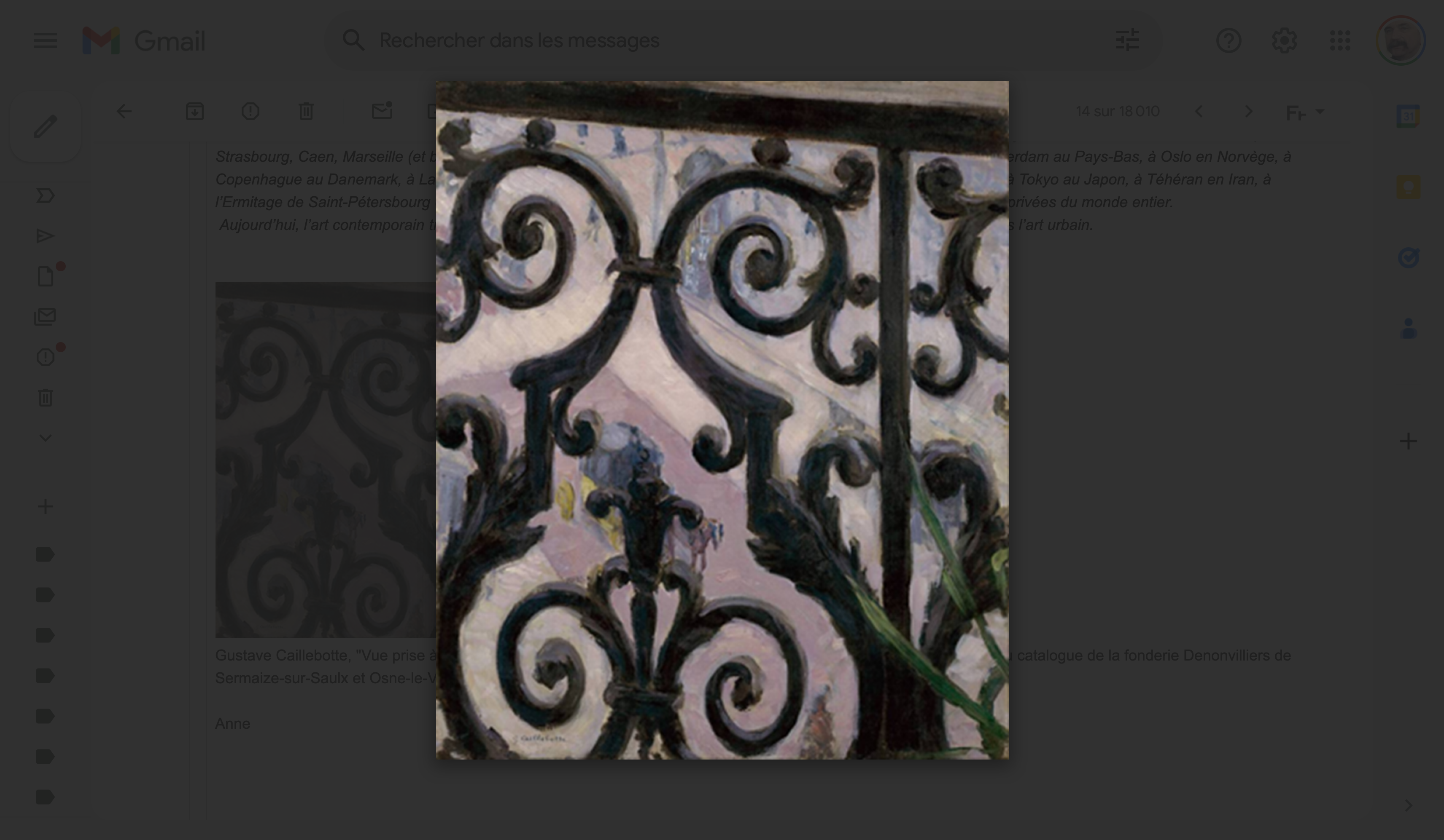 Ce n’est qu’au XIXe siècle, en même temps que se développe l’industrie de la fonte décorative, que le thème du balcon et de son garde-corps métallique connaît un développement considérable dans la peinture qui renouvelle alors ses sujets. A cette époque, le balcon en fonte devient le symbole de la modernité, de la prospérité bourgeoise et industrielle, de la capitale des arts qu’est Paris ; les artistes peignent les garde-corps en fonte avec une application telle qu’on peut identifier la plupart dans les catalogues des fonderies Val d’Osne, Durenne, Brousseval, Denonvilliers, Capitain-Gény ou Salin !