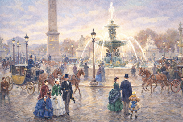 Ci-dessous, place de la Concorde : prompt : ambiance 1850, style aquarelle, personnages autour de la place : piétons, calèches