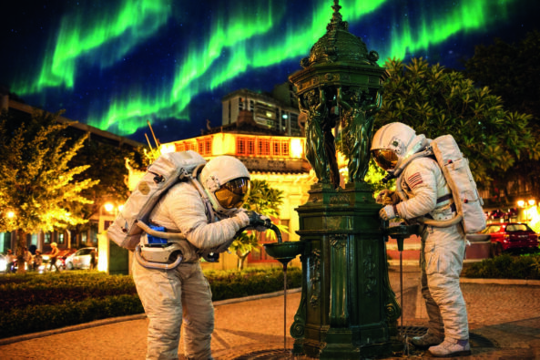Ces deux cosmonautes auront du mal à boire à la fontaine Wallace. En tenue de ville, c’est plus facile !
