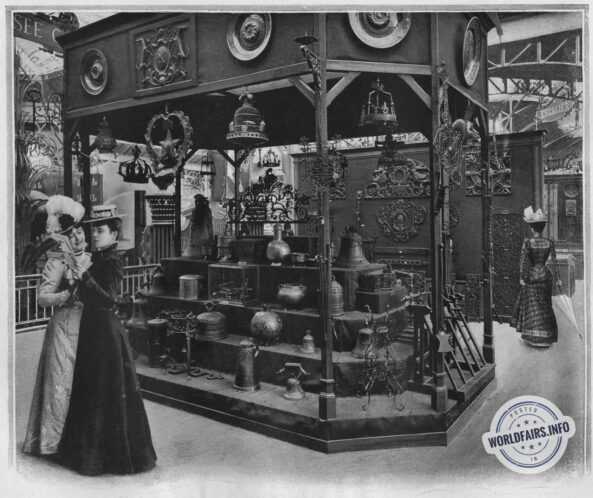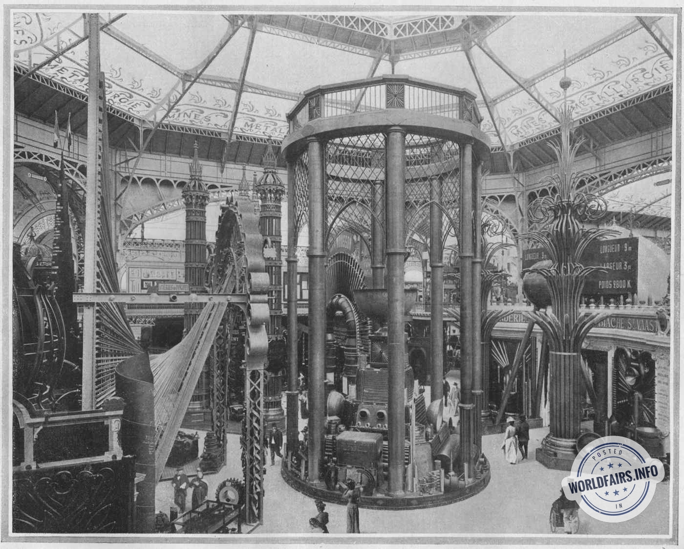 Les Forges de Pont-à-Mousson dressent des colonnes de tuyaux et de cylindres en fonte ; celles de l’Escaut et de la Meuse assemblent des tubes d’acier; les, Laminoirs de Bierche et de Saint-Waast projettent jusqu’au toit des gerbes éclatantes de tubes laminés surmontées d’énormes boules de cuivre; le groupe de la Loire (Saint-Etienne, Firminy, Saint-Chamond, Clandinon) affirme sa vitalité par d’énormes canons en matière brute, par des plaques de blindage, des ancres de marine géantes. La Vieille-Montagne nous offre une brillante exposition de son industrie en zinc; Micheville envoie des vases énormes faits en rails de poutres de fer (l’un de ces vases a 18 mètres de haut); Châtillon des tourelles blindées; les usines Delaunay-Belleville, un générateur perfectionné. Auprès de ces colosses sont, à leur rang, les Forges du Saut-du-Tarn, Hennebont, Montataire, Denain et Anzin, les Aciéries de France, les Forges du Nord et de l’Est, Pontgibaud, les Hauts Fourneaux de Maubeuge, les Forges de l’Ariège, les fonderies de Harfleur, la Compagnie Royale Asturienne, le Métal déployé, les Cuivres de France, la Compagnie d’Alais, les pompes pour puits de la maison H. Lemaire, etc., etc. »