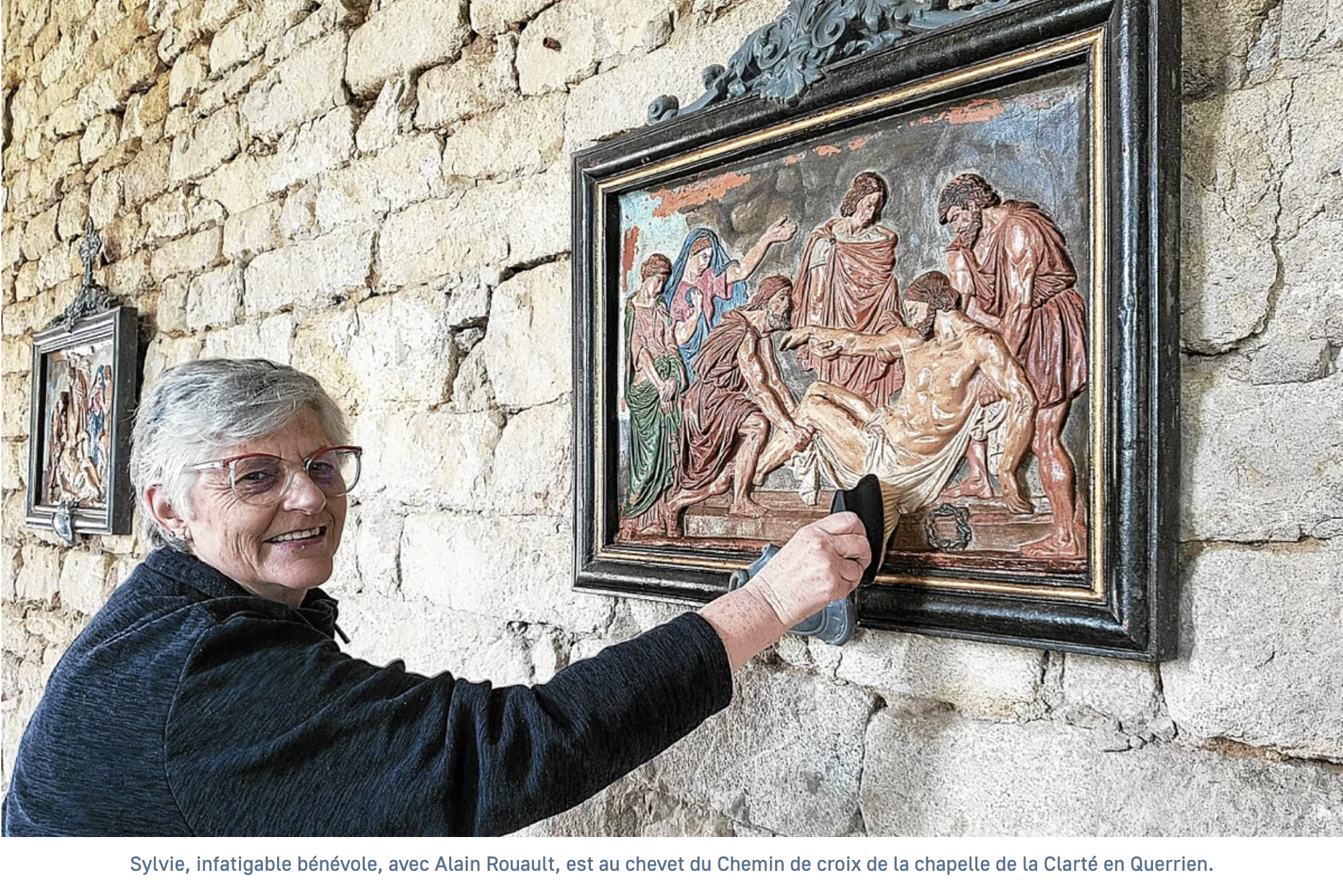 En effet, cette semaine, ce Chemin de croix brille d’un éclat nouveau car tous deux se sont penchés sur chacune des stations, expliquant qu’il était nécessaire de les brosser, nettoyer et dépoussiérer : « Il s’agit, précise Alain, de moulages en fonte pour lesquels il fallait aussi mettre en valeur les cartouches associés avec le numérotage de chaque scène de la crucifixion ». « On peut remarquer, ajoute Sylvie, la brillance et le relief retrouvés des drapés et des corps qui ont recouvré par la même occasion leurs couleurs ». Un travail qui met une nouvelle fois en évidence le labeur des deux bénévoles attachés au patrimoine du village de la Clarté.