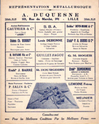 Quant au prospectus de A. Duquesne à Lille qui donne aussi dans la représentation métallurgique, il nous donne à voir la mention de P. Salin (en bas à gauche) : hauts-fourneaux, fonderies – proposant des fontes d’ornement et des panneaux de portes aux côtés d’entreprises aux spécialités les plus diverses.